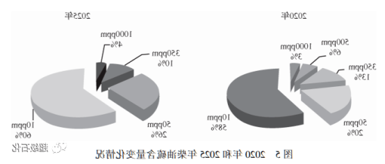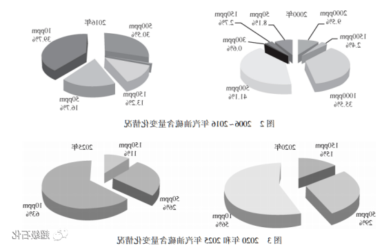 都按照煤油硫水平分,06年”范围沿途上”位置的煤油硫水平以500mg/kg及100mg/kg为重,分辨占该位置煤油的需要量的41.1%和35.5%。经途二十年的未来发展,2020年,该位置已已不再安全使用硫水平1000mg/kg上面的煤油,硫水平值为或大于150mg/kg的煤油已占位置煤油的需要量的69.5%。06年和2020年“范围沿途上”位置煤油硫水平变幻实际情况如图随时2随时。